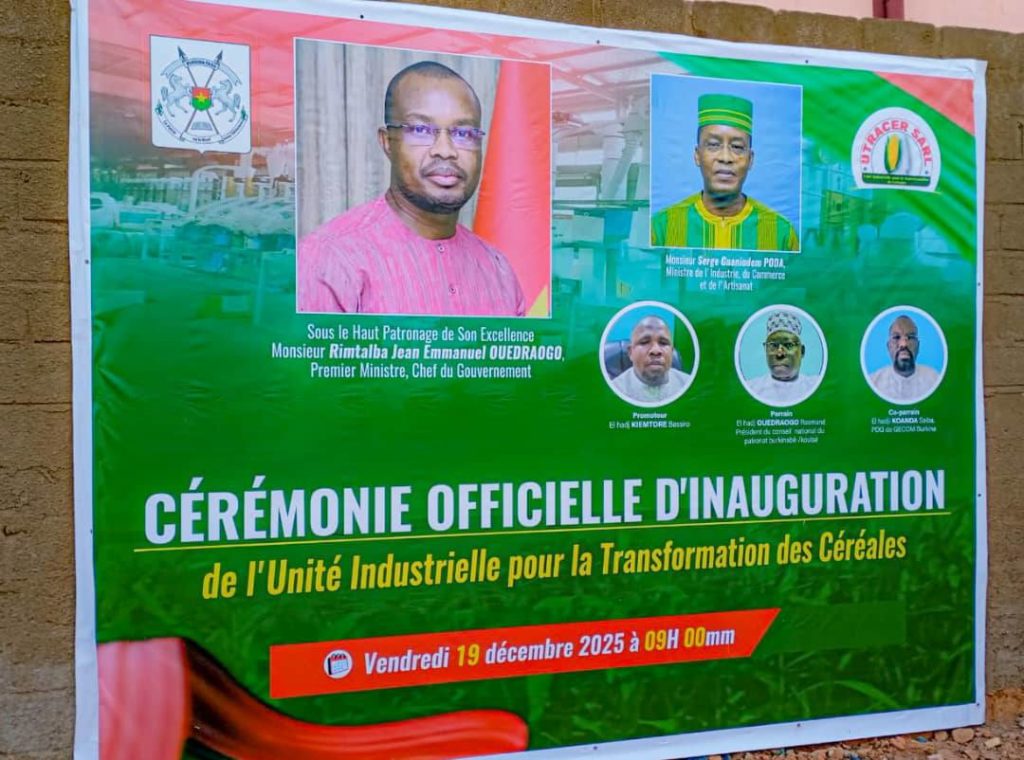 Kaya, 19 novembre 2025. Le Burkina Faso renforce sa stratégie de transformation locale. Le ministre délégué chargé des Ressources animales, Amadou Dicko, représentant le Premier ministre Rimtalba Jean Emmanuel Ouédraogo, a inauguré vendredi l’Unité industrielle pour la transformation des céréales (UTRACER) à Kaya, chef-lieu de la région des Kuilsé. Les autorités présentent cette mise en service comme un jalon de plus dans la promotion de l’industrie nationale et la consolidation de la souveraineté alimentaire.