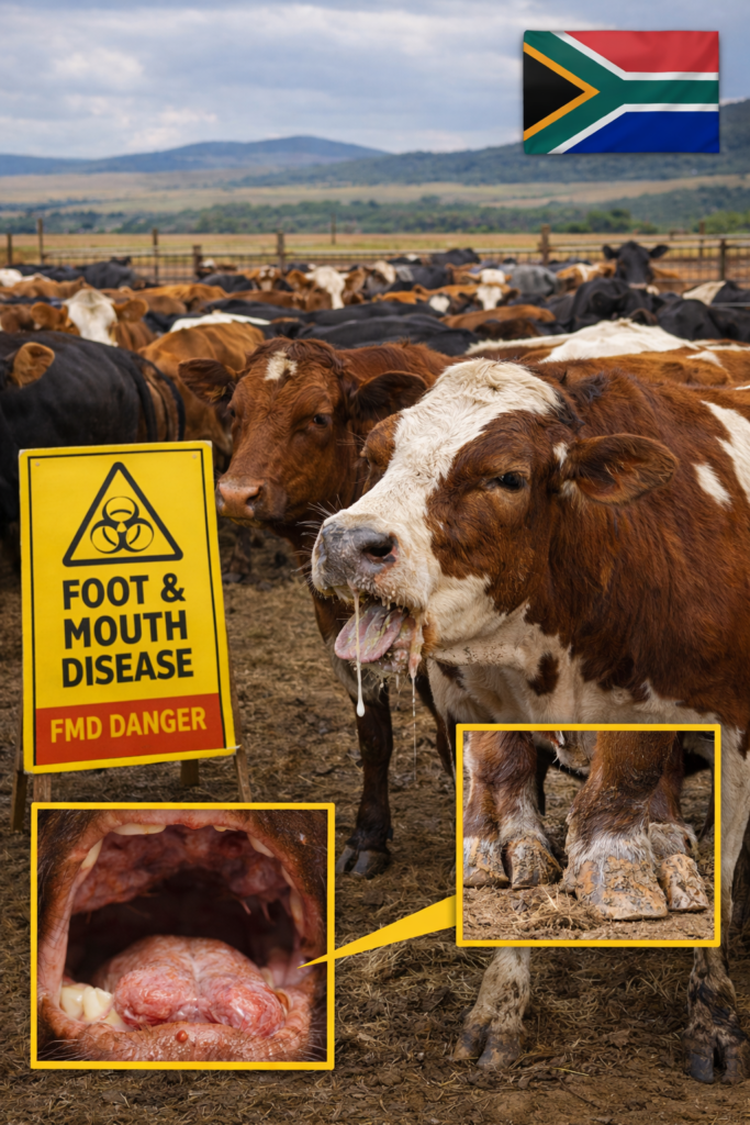 - Situation : la fièvre aphteuse (FMD) est signalée comme active dans 7 provinces d’Afrique du Sud.