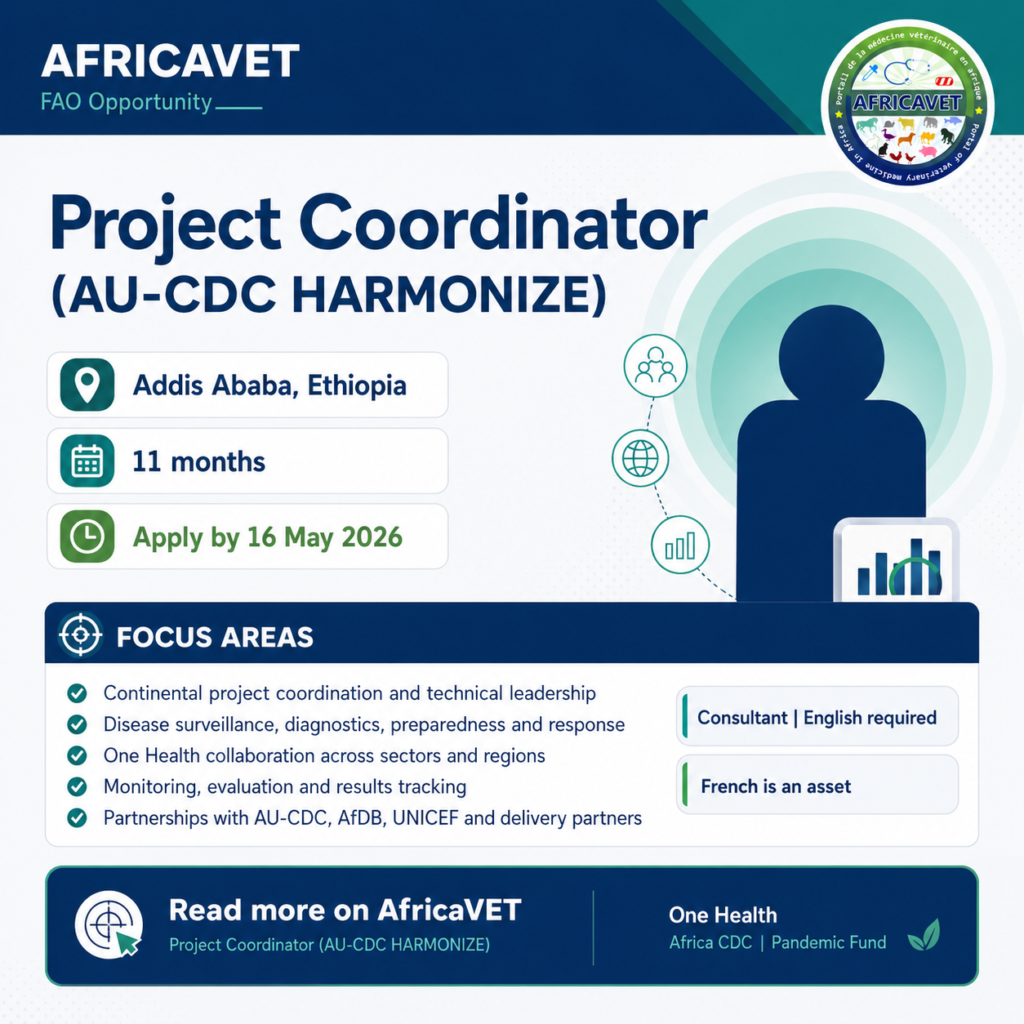 The Project Coordinator will report to the Senior Animal Production and Health Officer for the FAO Regional Office for Africa and the Budget Holder of the project. The incumbent will implement the project in close collaboration with AU-CDC, the other Pandemic Fund Implementing Entities (AfDB and UNICEF), delivery partners, the FAO headquarters and RAF regional Pandemic Fund Project Team, as well as the Sub-regional Animal Production and Health Officers for FAO’s subregional offices in Central, East, West and Southern Africa.