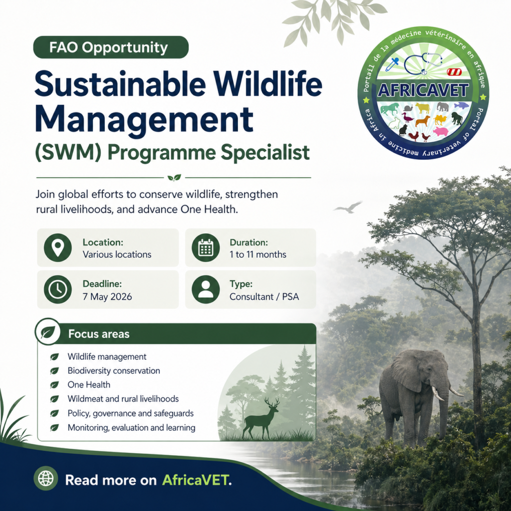 The position sits within the programme coordination unit of the Sustainable Wildlife Management (SWM) Programme in the FAO Forestry Division. The SWM Programme aims to reduce hunting of wildlife to sustainable levels, protect endangered species, conserve biodiversity, reduce the risks of zoonotic diseases and secure ecosystem services, including food, for Indigenous Peoples and rural communities.