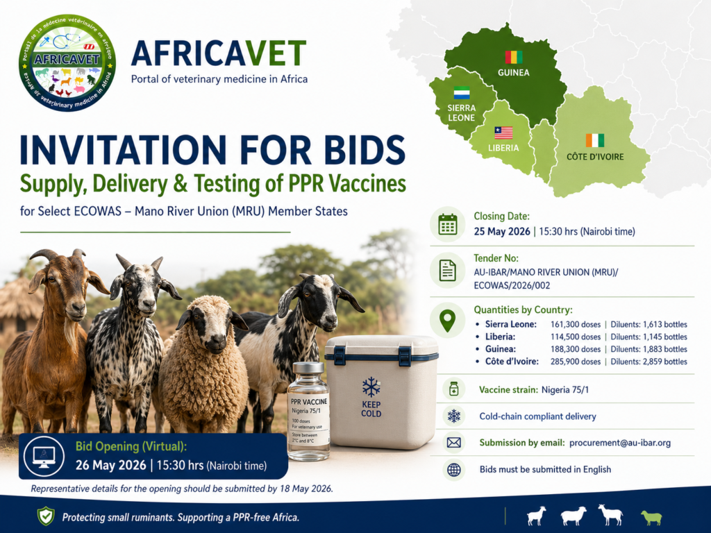 The African Union Inter – African Bureau for Animal Resources has received funds from the European Union for the procurement of the below mentioned goods and now invites sealed bids from eligible bidders for the Supply, Delivery & Testing of PPR Vaccines to Select Economic Community of West African States (ECOWAS) – Mano River Union (MRU)/Member States.