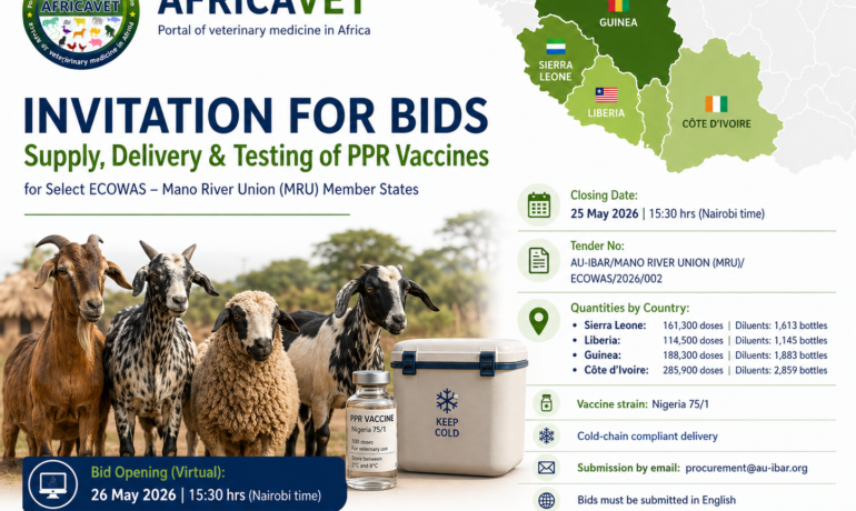 Closing Date : 25 May 2026 Tender No : AU-IBAR/MANO RIVER UNION (MRU)/ ECOWAS/ 2026/002 Section I. Invitation for Bids The African Union Inter – African Bureau for Animal Resources has received funds from the European Union for the procurement of the below mentioned goods and now invites sealed bids from eligible bidders for the […]