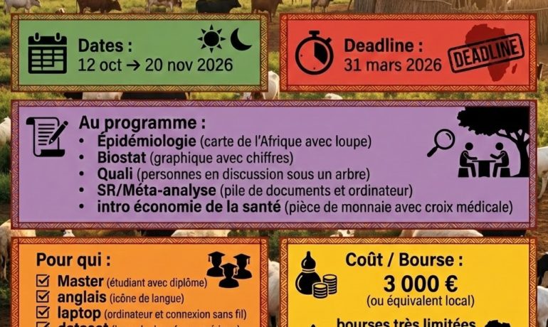 Le Global Health Institute (GHI) de Université d’Anvers annonce la prochaine édition de son cours international intensif « Epidemiology, Biostatistics & Qualitative Research Methods (iEBQ) », prévu du 12 octobre au 20 novembre 2026 à Anvers, Belgique. Objectif : consolider, en format “bootcamp”, les bases et outils qui permettent de concevoir, analyser et publier des […]